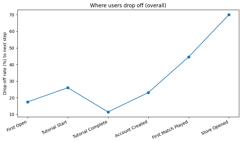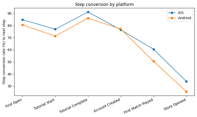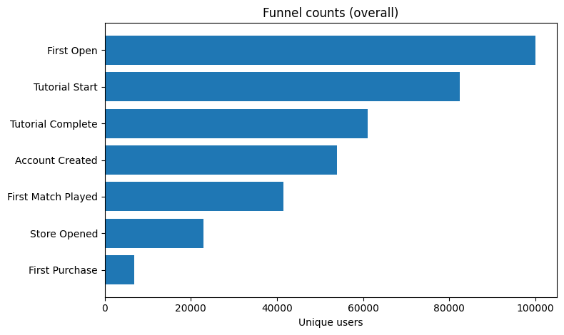 퍼널: First Open → Tutorial Start → Tutorial Complete → Account Created → First Match Played → Store Opened → First Purchase