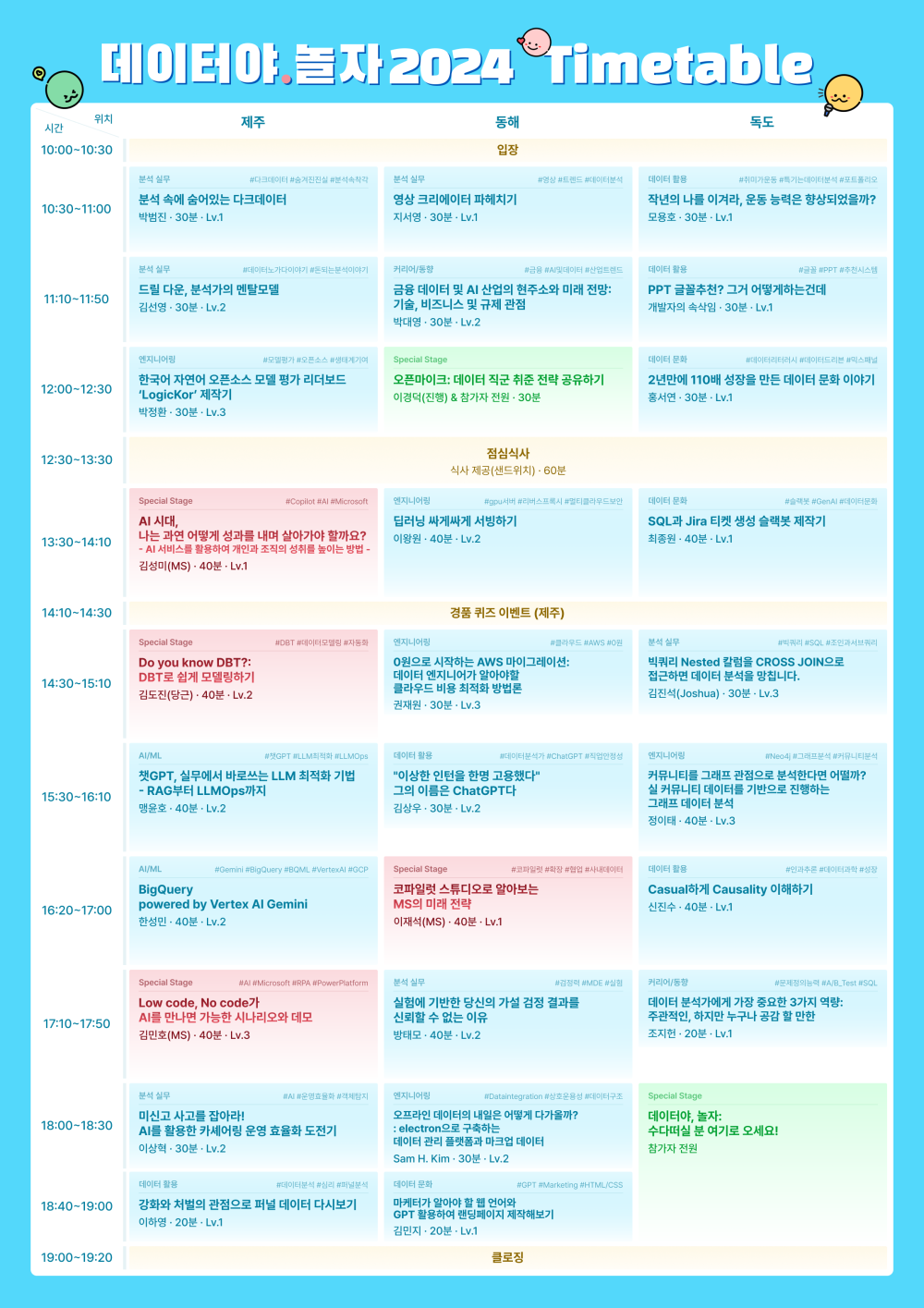행사 구성 : 3개의 강의실이 있고 각 강의실에서 연사가 강의하면 참가자가 원하는 강의를 듣는 형식 강의는 데이터 분석과 관련된 다양한 주제로 진행된다.
